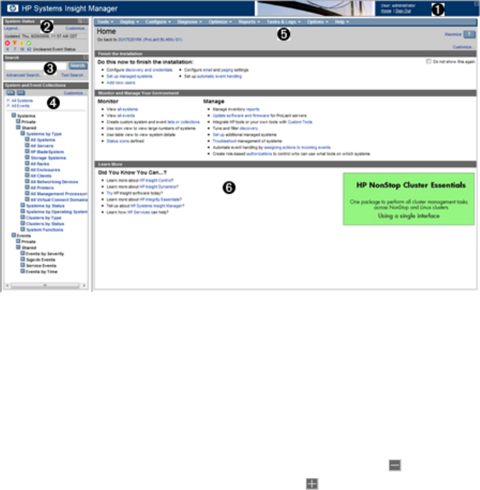 1. Banner area The banner provides a link to the Home page, a link to Sign Out of HP SIM,