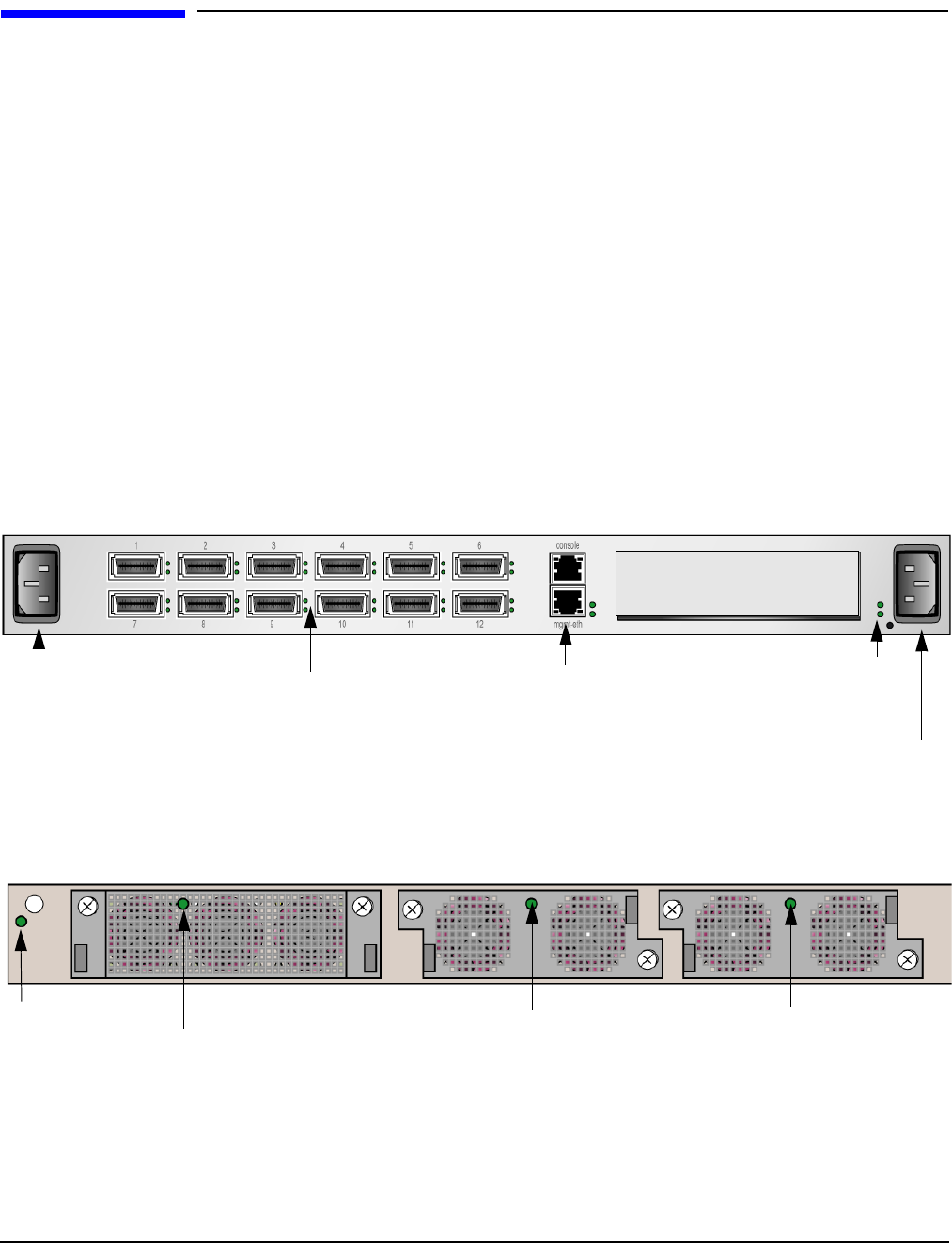 The power supply, system, and fan LEDs are located on the front of the HP Fabric Clustering System Switch.