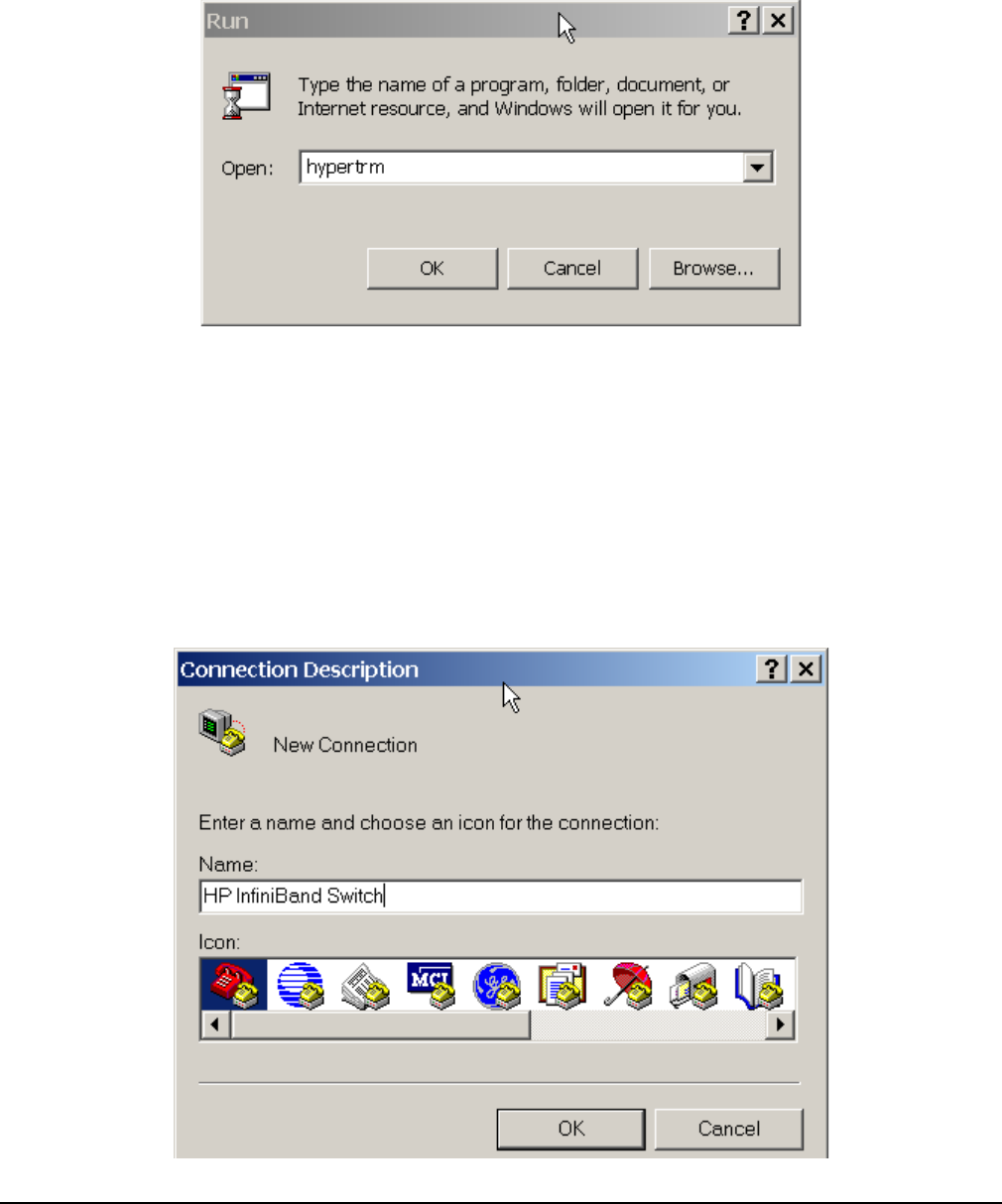 When HyperTerminal starts, you are presented with a Connection Description dialog box.