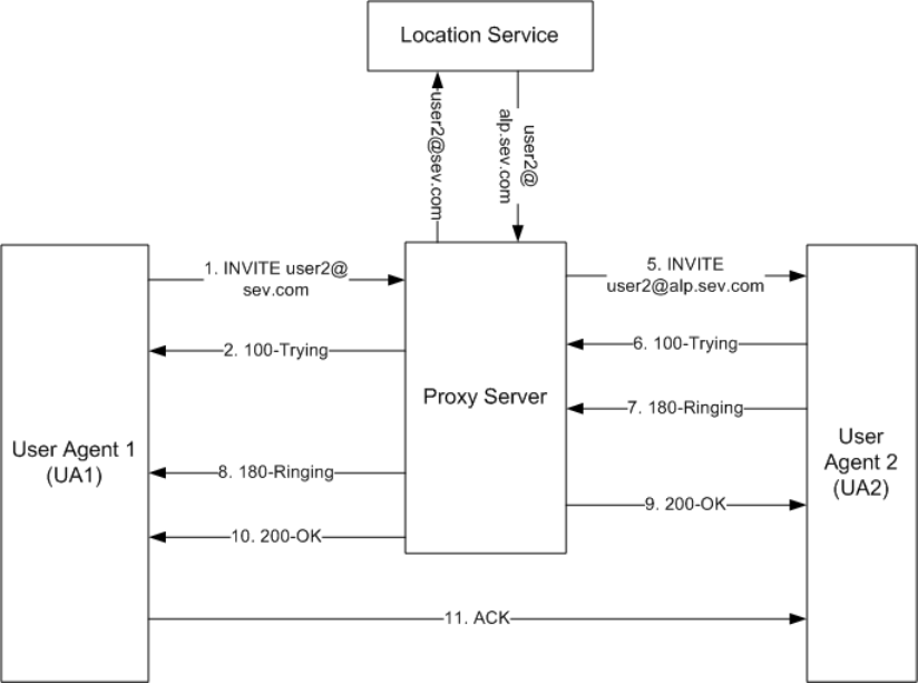 1. UA1 sends an INVITE request to UA2. This request is first sent to the proxy server