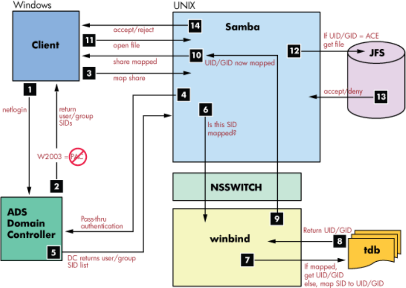 7. The Winbind daemon checks the SID and user name against ID mapping data in the Trivial