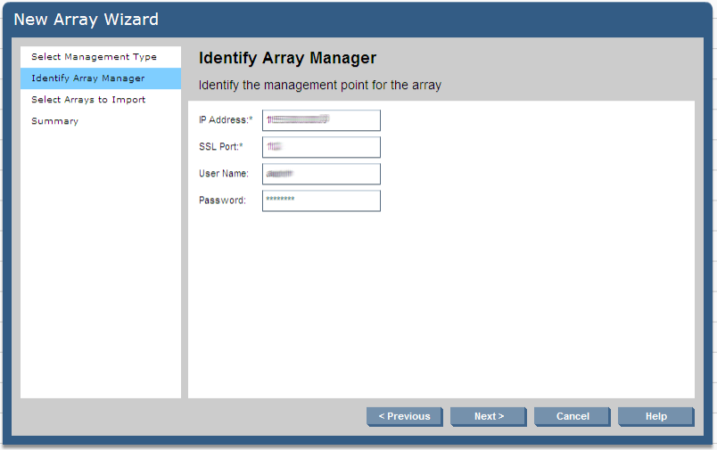 6. If you selected Manage Array Using SMI-S, enter the IP Address, Port, User Name, and Password