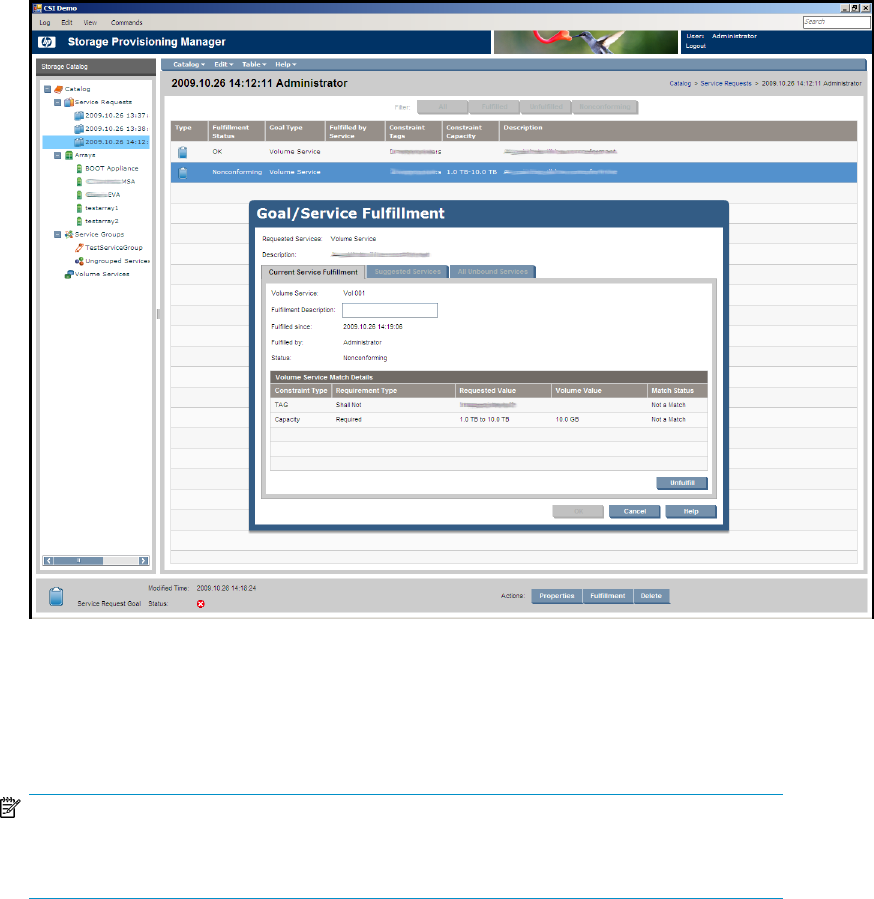 The Goal/Service Fulfillment dialog box displays, initially showing the Current Service Fulfillment