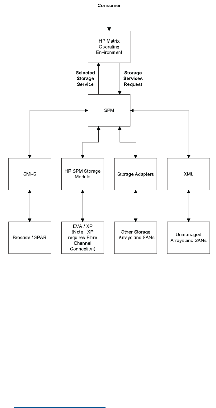 The HP Matrix OE infrastructure orchestration capability works with SPM to provide storage services