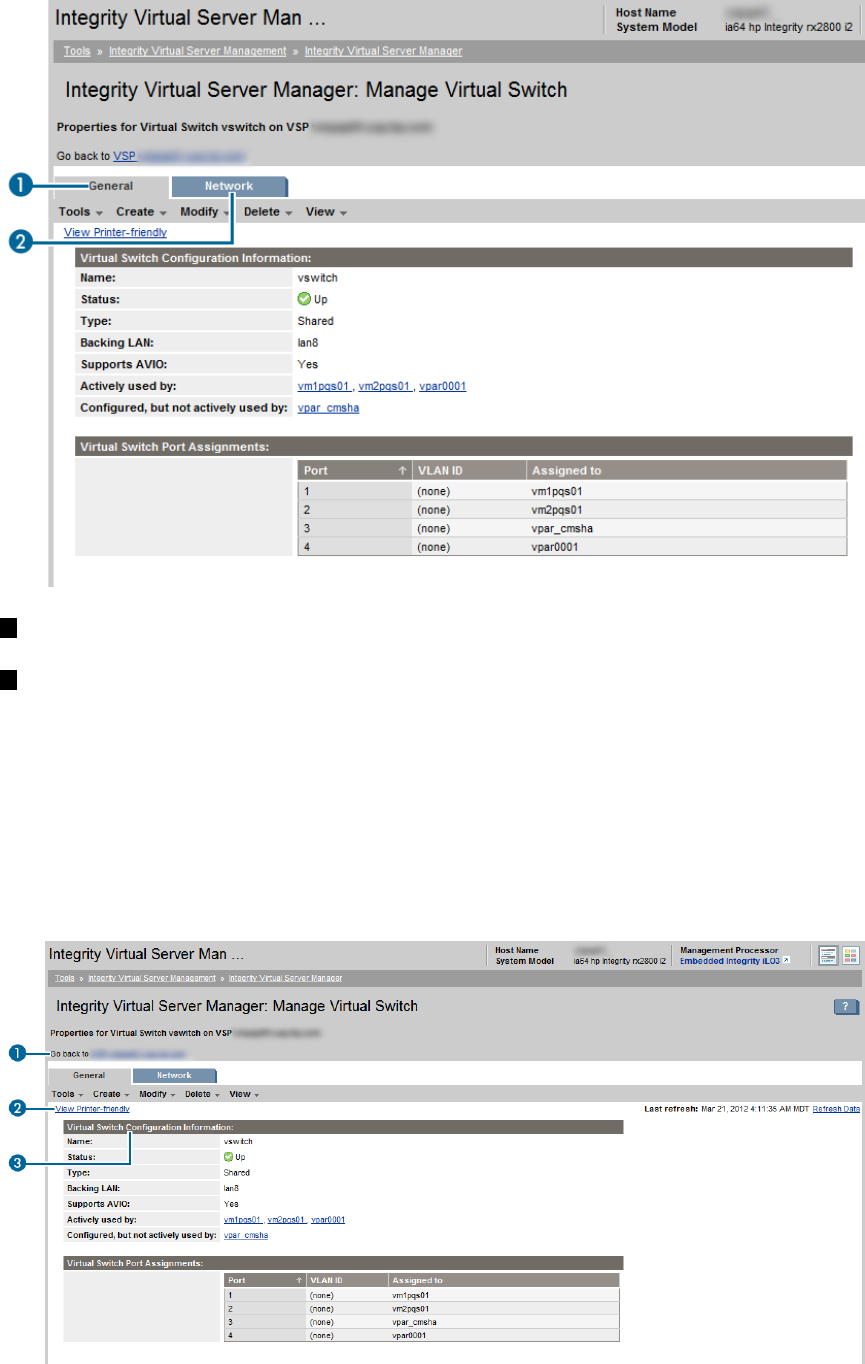 The “Vswitch Properties Network tab” (page 71) displays network details about the virtual