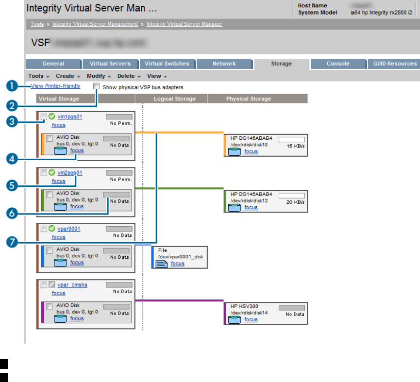 The VSP Storage tab shows the mappings from the virtual storage devices in the VMs or vPars to