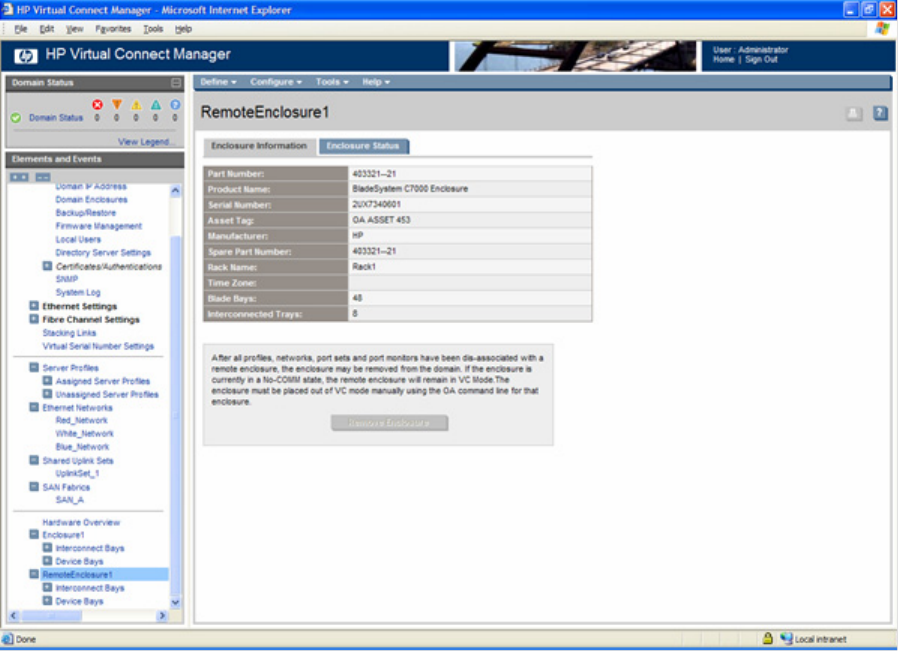 To remove a remote enclosure, disassociate all profiles, networks, port sets, and port monitors from the