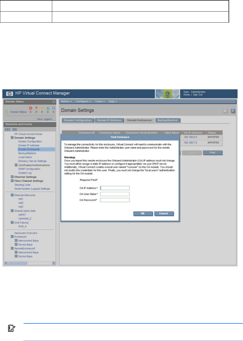 Adding and importing a remote enclosure requires full domain and server privileges. Virtual Connect