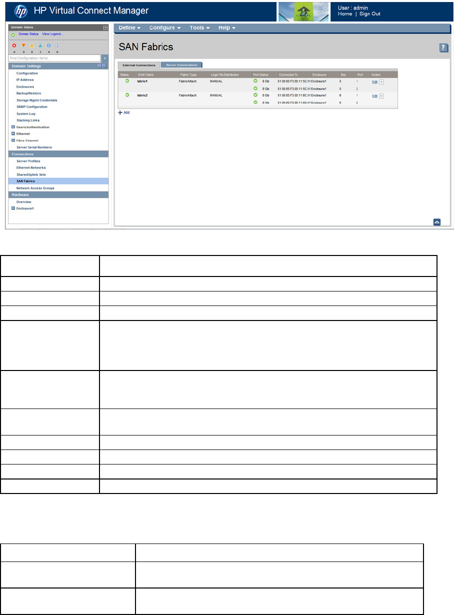 This screen lists all of the SAN fabrics that have been created and displays the external connection