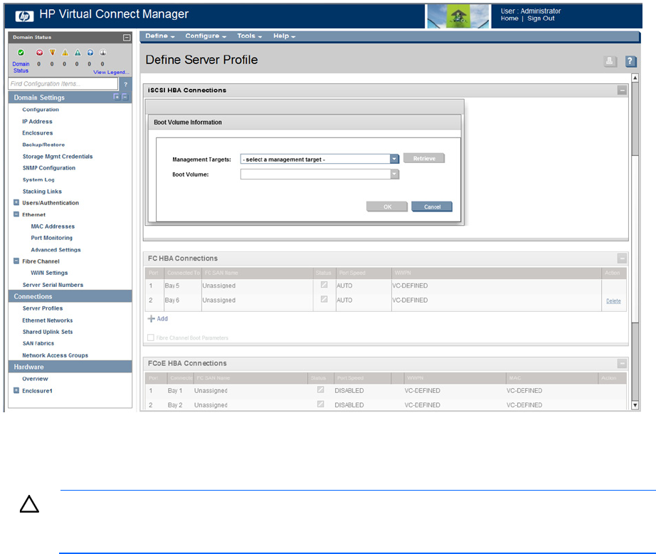 4. Click OK. The Flex-10 iSCSI Connections screen ("Flex-10 iSCSI connections" on page 189) appears