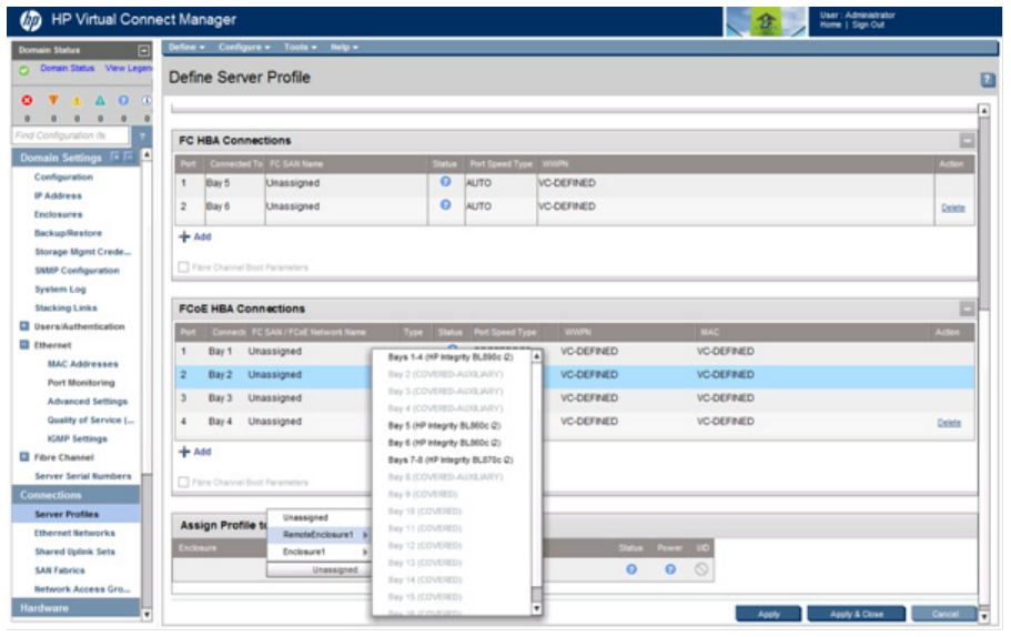 - Assigning a server profile with FCoE connections to an HP ProLiant BL680c G7 Server Blade