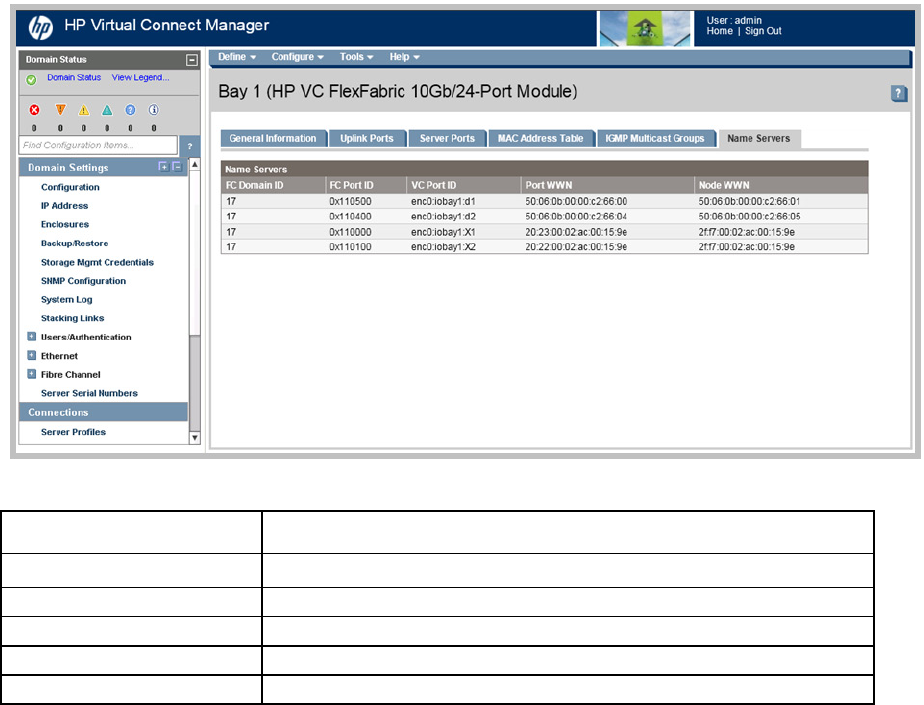 This screen contains a list of entries in the name server table for the VC FlexFabric module.