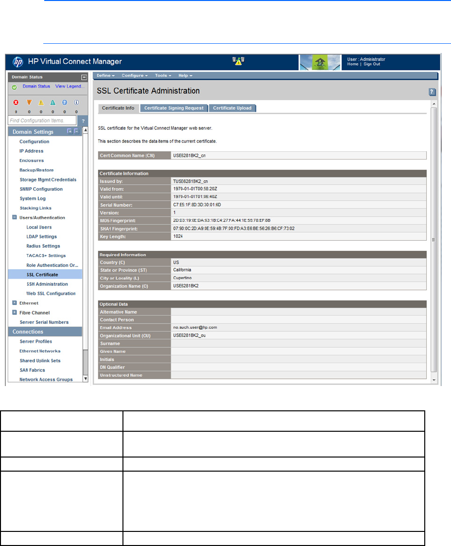 The following table describes the fields on the SSL Certificate Administration (Certificate Info) screen.