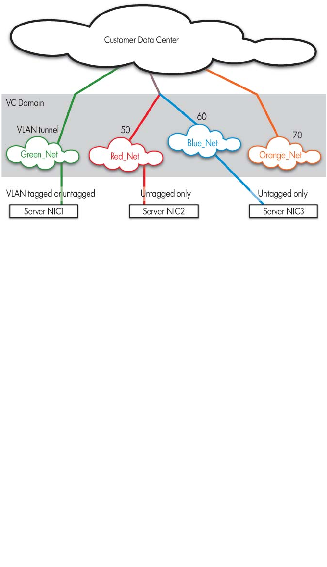 VLAN tags are tunneled through Virtual Connect unchanged. On the shared, red and blue networks, uplink