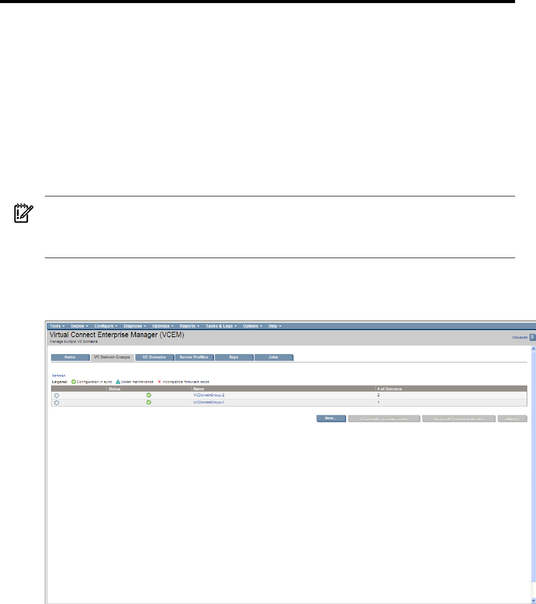 To access the VC Domain Groups page in VCEM, click the VC Domain Group tab. The VC Domain