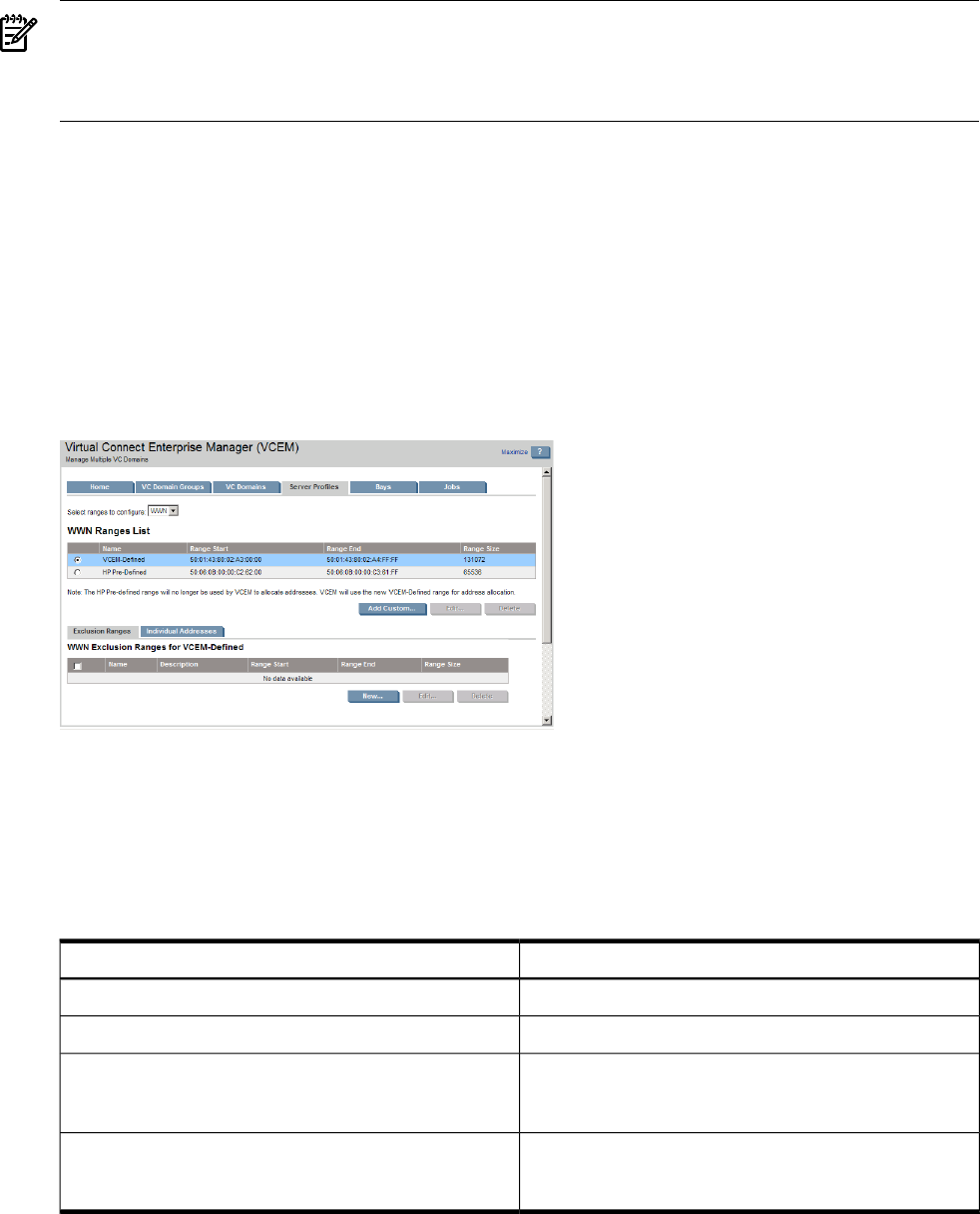 Individual addresses in a WWN range (HP-predefined, VCEM-defined, or user-defined) can be