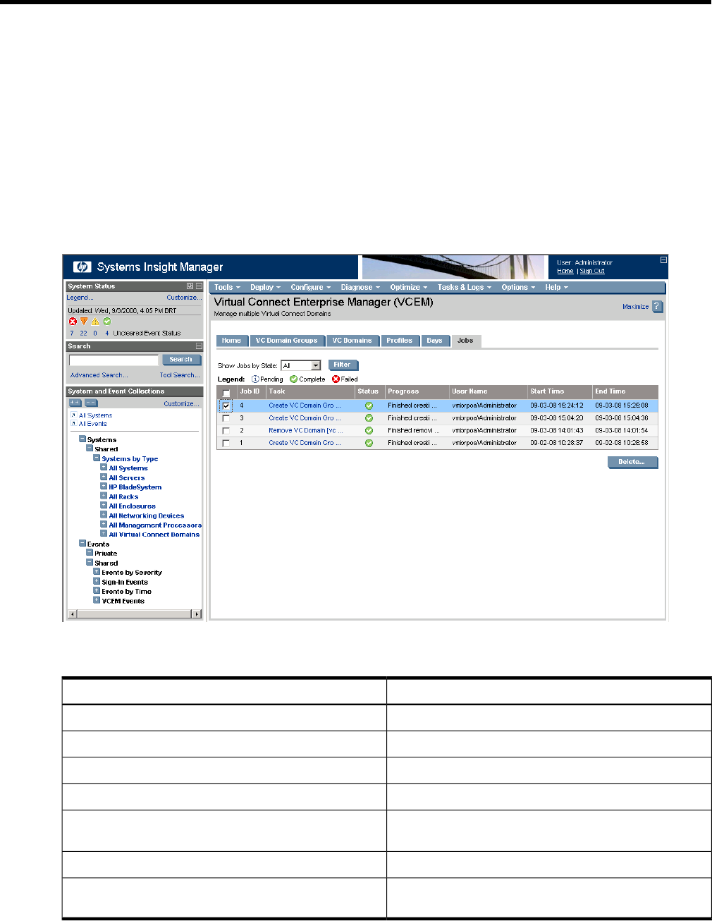 The Jobs list provides detailed information about jobs that have occurred and are related to VCEM.