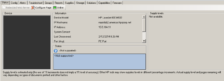 Notice in the following example of a USB connected HP LaserJet M602 that only the model name is