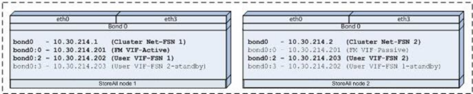 • bond0:3 is not active, but is provisioned for failover of file services duties from StoreAll node
