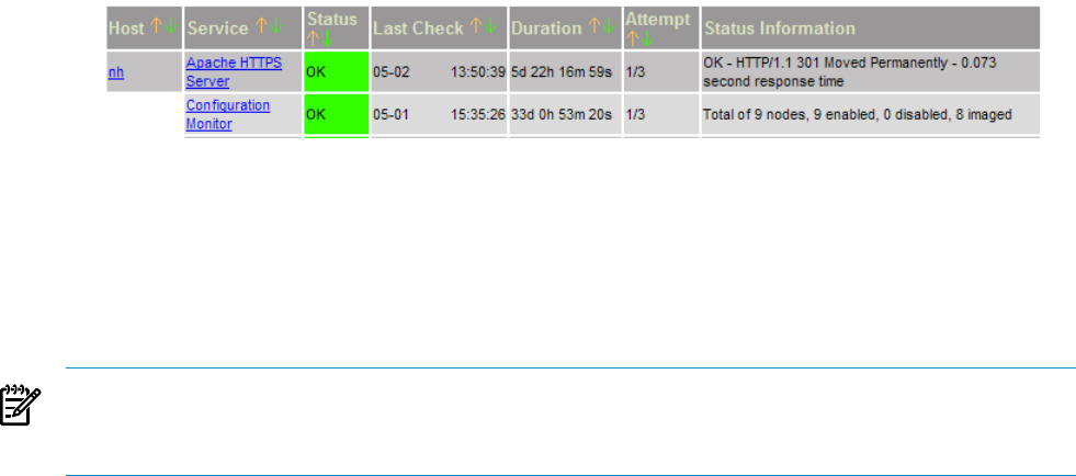 Nagios reports messages in the Service Detail and Service Problems windows. These messages