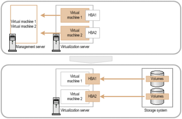 2. Allocate the LUN paths of volumes to each virtual machine (WWN), and then make the virtual