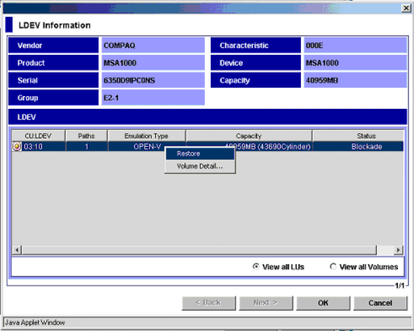 3. In the Device list, right-click the external LU you want to restore, and select LDEV Information. The LDEV