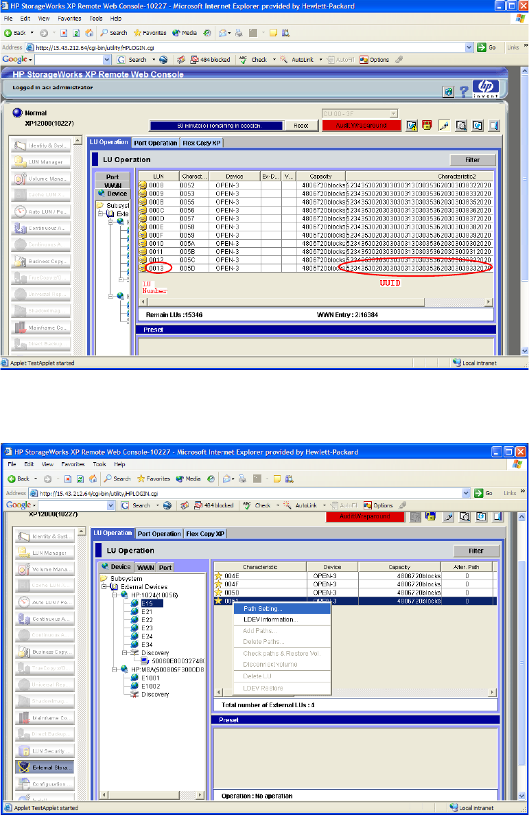 1. In the XP Remote Web Console main pane, click the External Storage button in the left pane. The LU