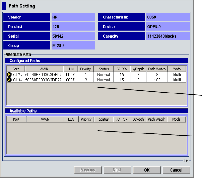 Status of alternate paths. The Alternate Path list consists of two tables. The Configured Paths table