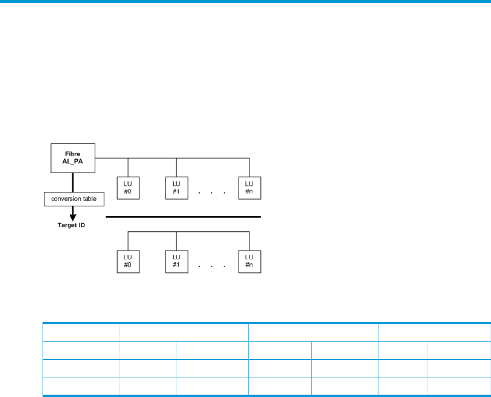 addresses to SCSI target IDs (TIDs) using a conversion table (see Figure 9 (page 52)).