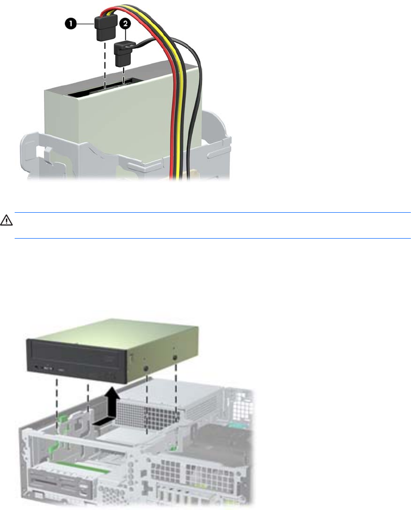 b. Disconnect the power cable (1) and data cable (2) from the rear of the optical drive.
