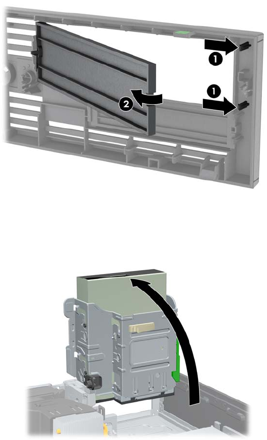 b. Slide the bezel blank back away from the bezel and to the left to remove it (2).