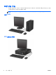 데스크탑에서 타워 구성으로 변경 초소형 폼 팩터 컴퓨터는 HP 에서 선택 사양으로 구입할 수 있는 타워 받침대를 사용하여 타워 방향으 로 사용할 수 있습니다. 1. 컴퓨터를 열지 못하게 하는 모든 보안 장치를 제거/분리합니다. 2. 컴퓨터에서 모든 이동식 미디어(예: CD 또는 USB 플래시 드라이브)를 제거합니다. 3. 운영체제에 따라 컴퓨터를 적절히 종료한 후 모든 외부 장치의 전원을 끕니다. 4. 콘센트에서 전원 코드를 뽑고 외부 장치를 모두 분리합니다. 주의: 전원이 켜져 있든 꺼져 있든 상관없이 시스템이 가동 중인 AC 콘센트에 연결되어 있으면 시스템 보드에 항상 전압이 흐르는 것입니다. 컴퓨터 내부 부품의 손상을 방지하려면 전원 코드를 분리해야 합니다. 5. 컴퓨터를 돌려 오른쪽 면이 아래쪽을 향하도록 하여 컴퓨터를 선택 사양인 받침대에 놓습니다. 참고: 타워 구성 시 컴퓨터를 안전하게 고정시키려면 선택 사양인 타워 받침대를 사용하는 것이 좋습니다. 6.