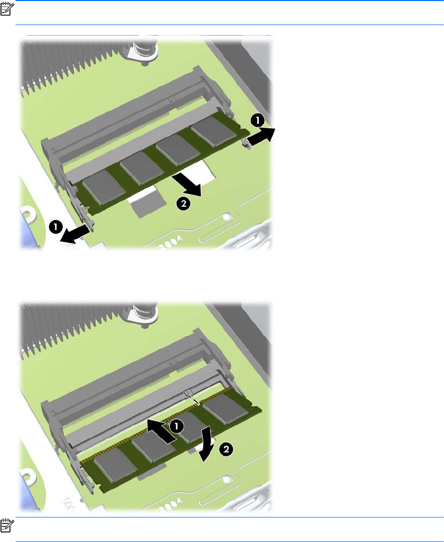 8. SODIMM 을 분리하려면 SODIMM 양 측면의 래치 2 개를 바깥쪽으로 누른 다음(1) 소켓에서