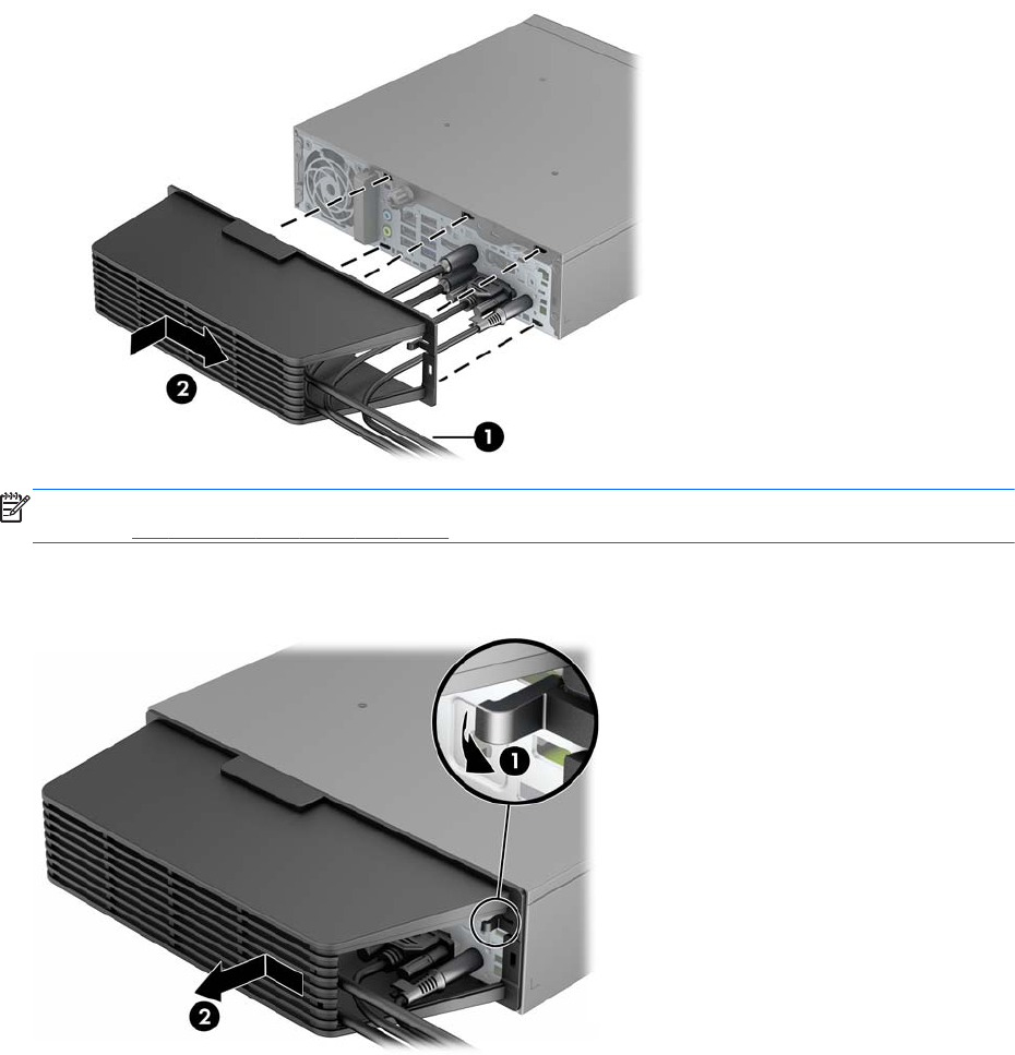 트 커버 덮개 쪽으로 밀고 (1) 덮개를 왼쪽으로 밀어 컴퓨터에서 빼냅니다 (2).