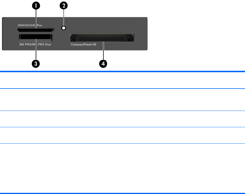 미디어 카드 리더는 일부 모델에서만 사용 가능한 옵션 장치입니다. 다음 그림과 표를 참조하여 미디어