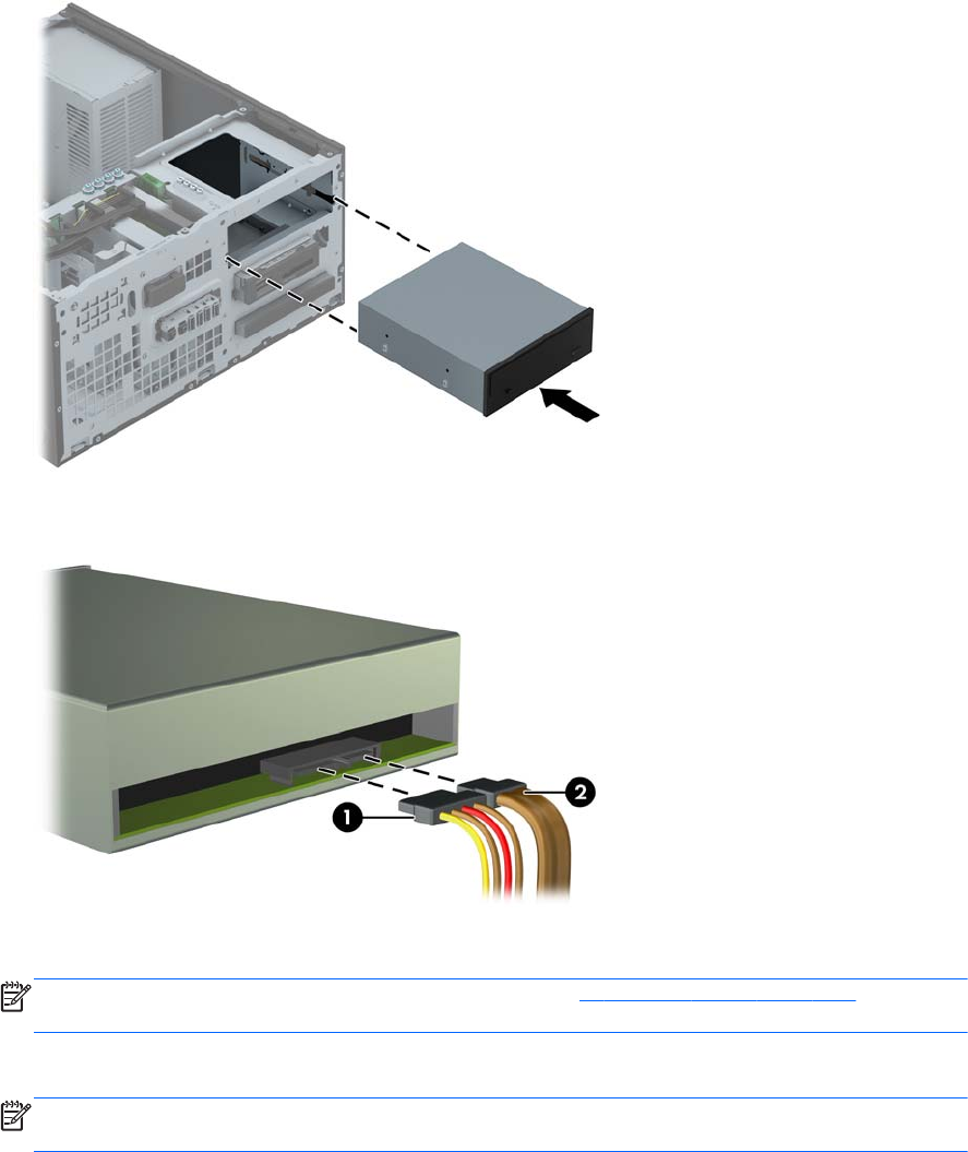 9. 전원 케이블(1) 및 데이터 케이블(2)를 광학 드라이브의 뒷면에 연결합니다.