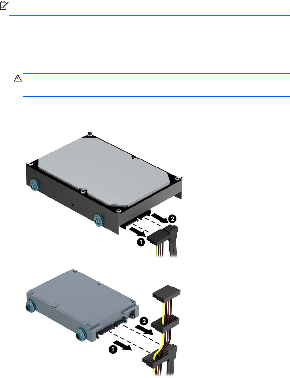6. 전원 케이블 (1) 및 데이터 케이블 (2)를 하드 드라이브 뒷면에서 분리합니다.