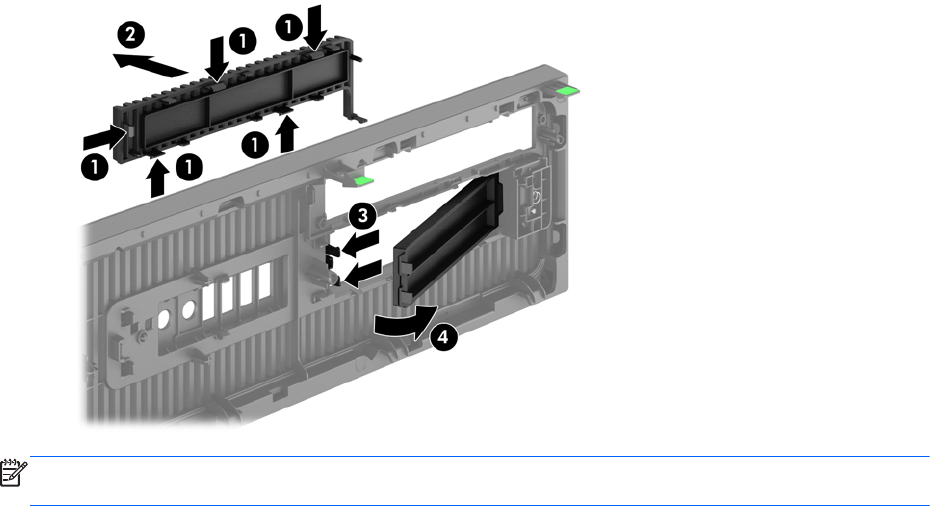 2. 3.5 인치 베젤 블랭크를 분리하려면 5 개의 고정 탭을 안쪽으로 누르고(1) 블랭크를 당겨 앞면 베