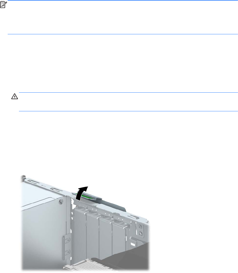 8. 래치의 녹색 탭을 들어 올린 다음 래치를 여는 방향으로 돌려서 슬롯 덮개를 고정하고 있는 슬롯