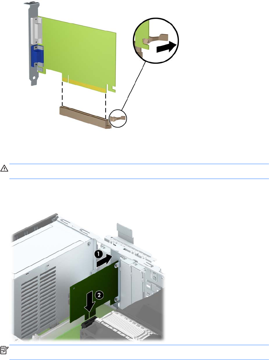 참고: 확장 카드를 설치할 때 전체 연결단자가 확장 카드 슬롯에 제대로 삽입되도록 카드를 힘껏