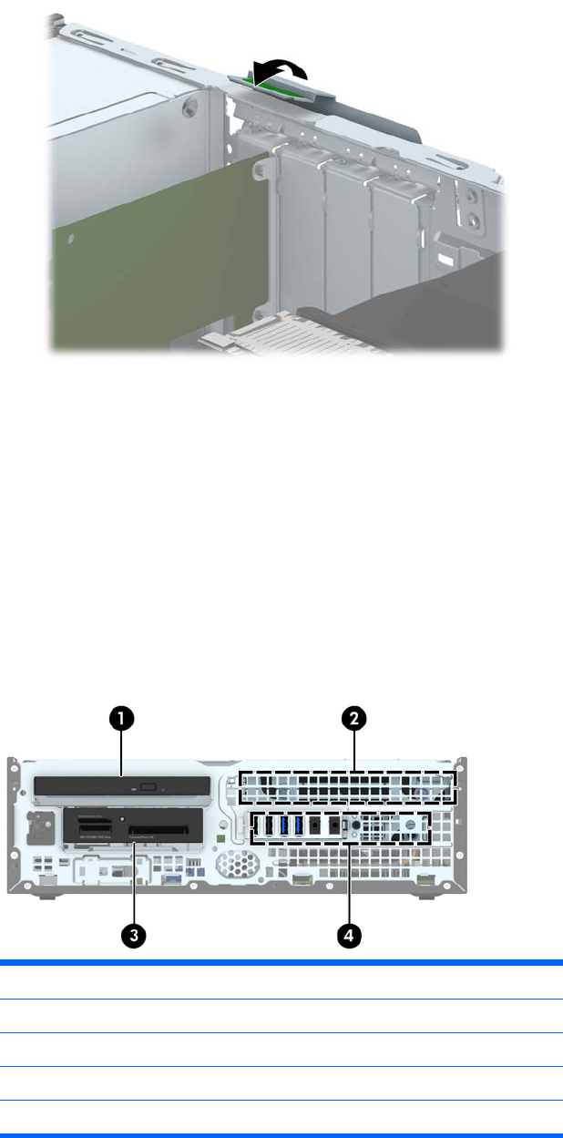 13. 슬롯 덮개 고정 래치를 뒤로 돌려 확장 카드를 고정합니다.