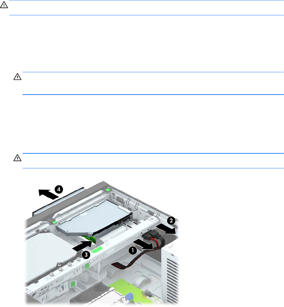 에 있는 녹색 분리 래치를 드라이브의 중심 방향으로 누른 다음(3) 드라이브를 앞쪽으로 밀어 앞