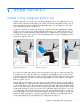잘못된 자세 손바닥을 작업대에 대거나 손목을 과도하게 아래로 구부리지 마십 시오. 잘못된 자세 손목을 과도하게 안쪽으로 구부리지 마십시오. 다음 지침을 따라 작업대를 조정하십시오. ● 목과 몸통이 비틀리지 않도록 키보드를 정면에 둡니다. ● 어깨, 팔, 손목과 손이 편안하도록 작업대의 높이를 조정합니다. 어깨는 긴장되지 않은 상태여야 하며 팔꿈치는 측면에 편안히 놓여야 합니다. 키보드의 홈 행("L"자가 있는 행)은 팔꿈치 높이 또는 그와 비 슷한 높이에 위치해야 합니다. 어깨가 움츠러들지 않도록 작업대의 높이를 조정해야 합니다. ● 작업대와 키보드, 포인팅 장치에는 팔뚝과 손, 손목이 직선으로 유지될 수 있도록 기울기를 세밀하게 조 정하는 장치가 있을 수 있습니다. 입력하거나 포인팅 장치를 사용할 때 손목을 구부리거나 기울이지 마 십시오. 힌트: 손목을 곧게 펴고 가운데 위치에서 입력하기가 어려운 경우 좀 더 사용하기 편안한 다른 디자인 의 키보드 또는 포인팅 장치가 필요할 수 있습니다.