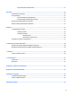 Alfabētiskais rādītājs A administratora parole 33 aizsardzība ar paroli pamodināšanai 29 akumulatora strāva 29 akumulators atlikušā uzlādes līmeņa parādīšana 30 enerģijas ekonomēšana 31 izlāde 30 rūpnīcas plomba 29 zems akumulatora uzlādes līmenis 30 aparatūra informācijas atrašana 11 atbalsts, saziņa 40 atmiņas karšu lasītājs, identificēšana 5 atmiņas karte/SIM sprauga, identificēšana 5 audio funkcijas, pārbaude 26 audio funkciju pārbaude 26 audio ievades (mikrofona) ligzda, identificēšana 6 audio izvades
