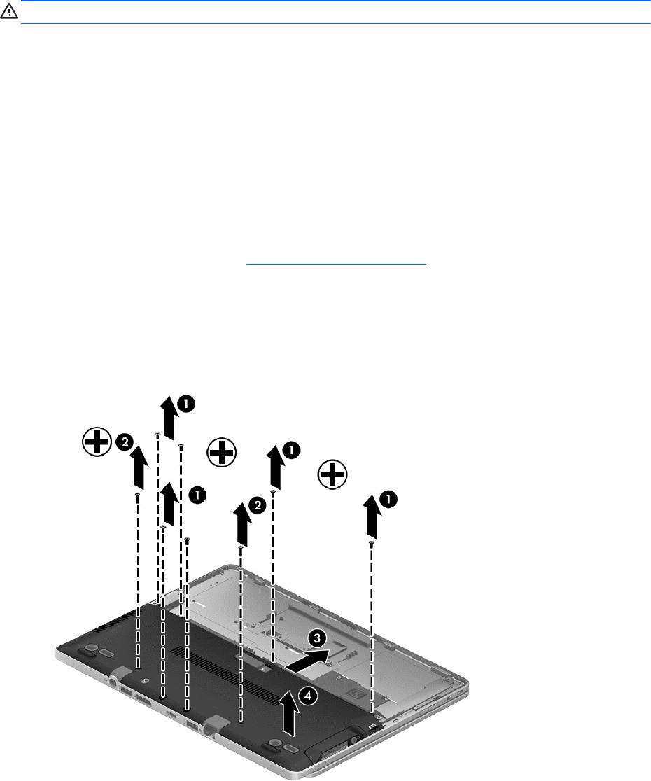 3. Servisný kryt posuňte smerom k prednej časti počítača (3) a nadvihnutím (4) ho zložte.