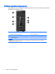 Priekinio skydelio komponentai Atsižvelgiant į modelį, diskų įrenginių konfigūracija gali skirtis. Kai kuriuose modeliuose yra dangtelis, dengiantis optinio diskasukio skyrių. 1 Plonasis optinis diskų įrenginys (pasirinktinis) 5 Standžiojo disko veikimo indikatorius 2 Dviejų būsenų įjungimo mygtukas 6 USB 3.0 prievadai (mėlyni) 3 Mikrofono jungtis 7 Ausinių jungtis 4 SD kortelių skaitytuvas PASTABA: Kai maitinimas įjungtas, maitinimo indikatoriaus lemputė paprastai šviečia baltai.