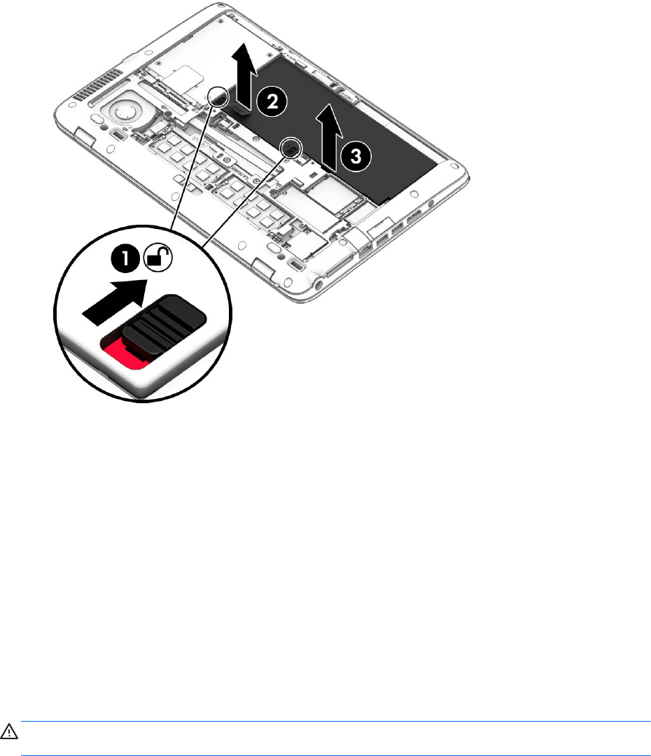 2. Pomaknite dva zasuna baterije u otključani položaj (1). Ispod zasuna vidjet ćete crvenu oznaku.