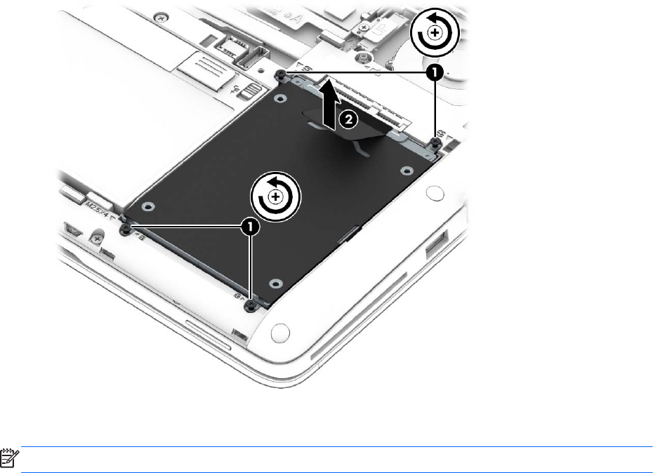 5. Otpustite četiri vijka na vratašcima tvrdog diska (1). Podignite jezičac s krpom tvrdog diska (2) te