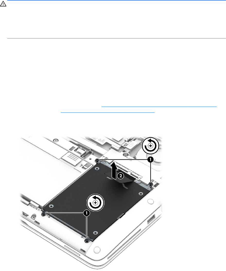 5. Otpustite četiri vijka na vratašcima tvrdog diska (1). Podignite jezičac od tkanine tvrdog diska (2)