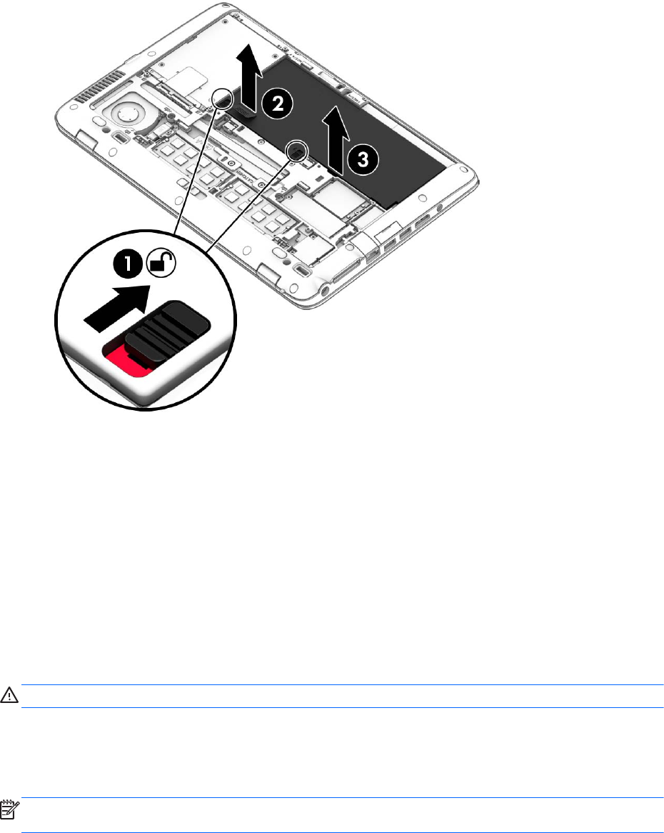 2. 배터리 분리 래치 2 개를 잠금 해제 위치로 밉니다(1). 그러면 래치의 빨간색 밑면을 볼 수 있습니